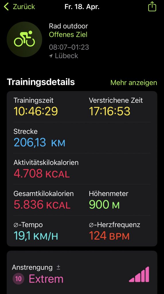 Mehr als 10 Stunden reine Fahrzeit (bei 20 km/h), über 17 Stunden unterwegs, rund 900 Höhenmeter, etwa 5.800 verbrannte Kalorien.