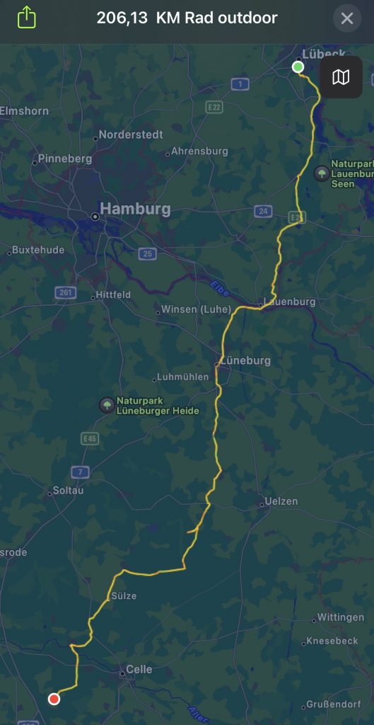 Unsere Route: von Lübeck nach Mellendorf, über Lauenburg, Lüneburg, quer durch die Heide, bis kurz vor Hannover.