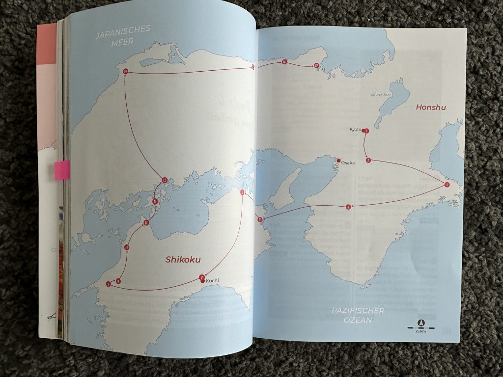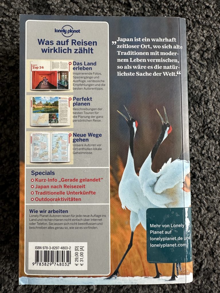 Für mehr Details in den verschieden Regionen, Orten und Städten haben wir uns auch noch den Japan Reiseführer von „lonely planet“ geholt. ISBN: 978-3-8297-4803-2